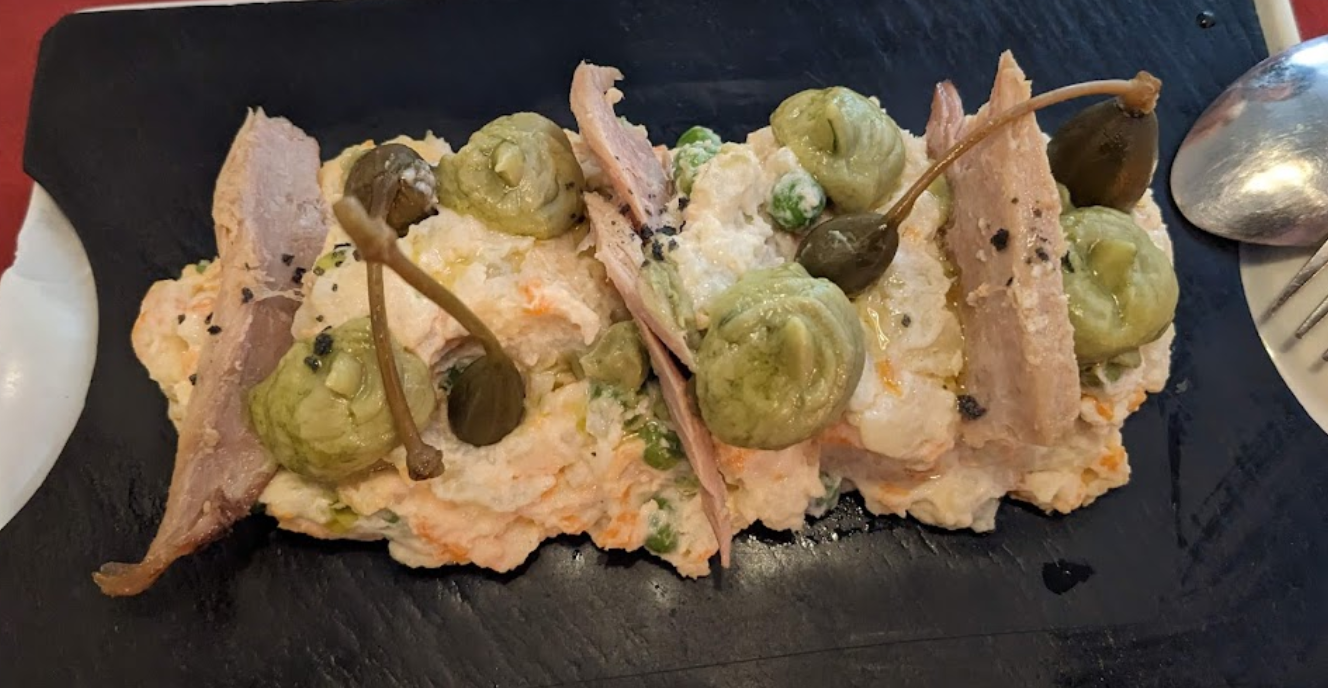 Platos típicos de la cocina española elaborados con ingredientes frescos y servidos en un comedor chic y moderno.